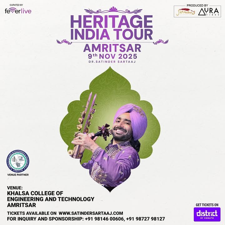 Join us with renowned Sufi artist Dr. Satinder Sartaaj at the National Conference 2025, hosted by Khalsa College of Engineering and Technology, Amritsar, on Friday, December 6, 2025, for an evening of elegance and celebration.